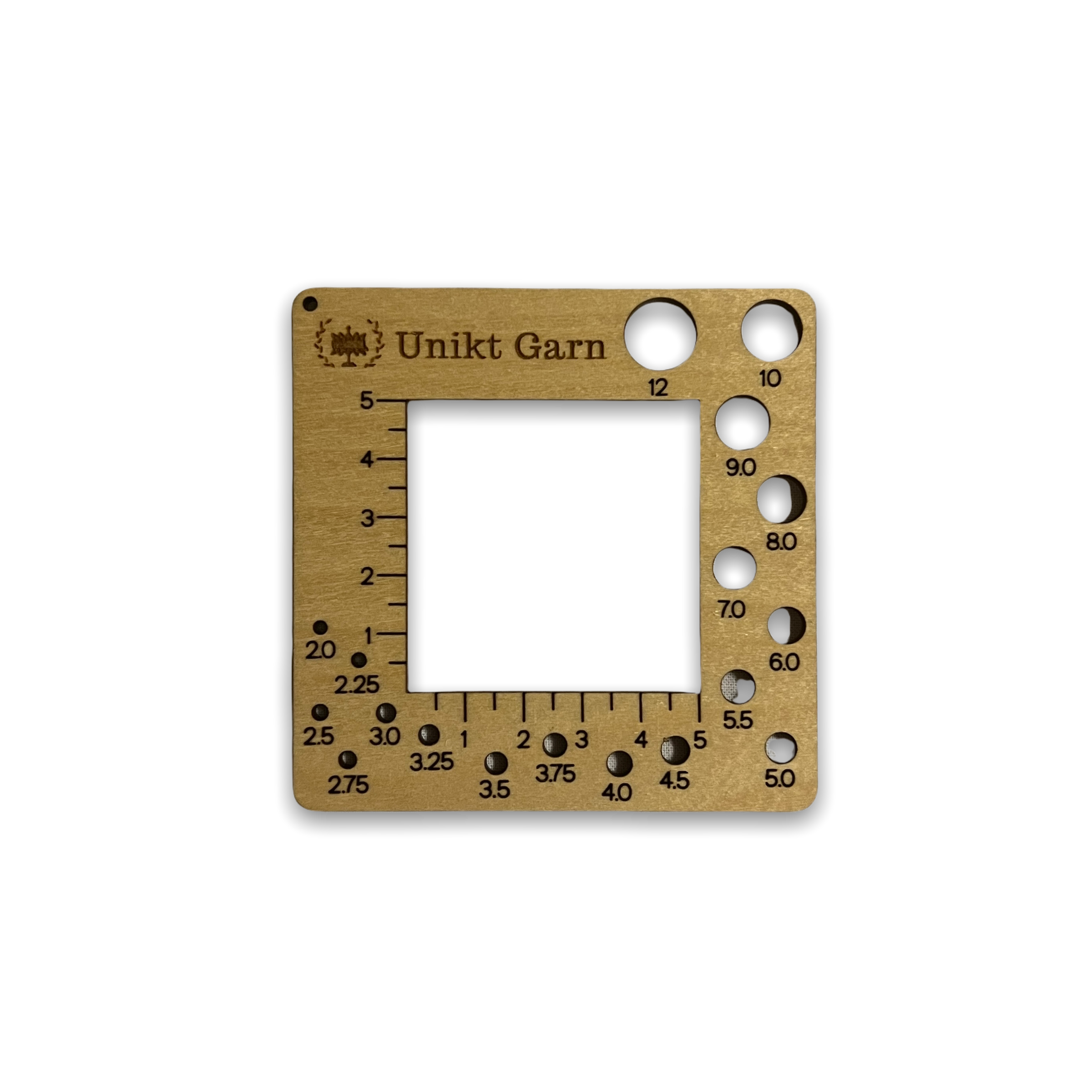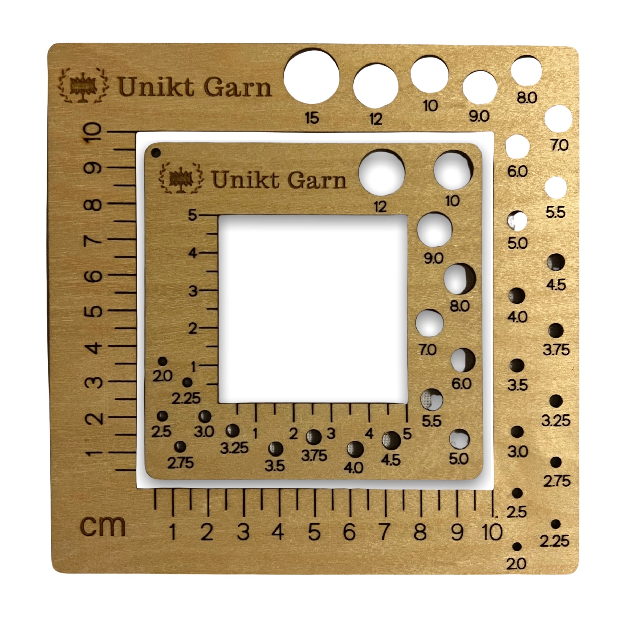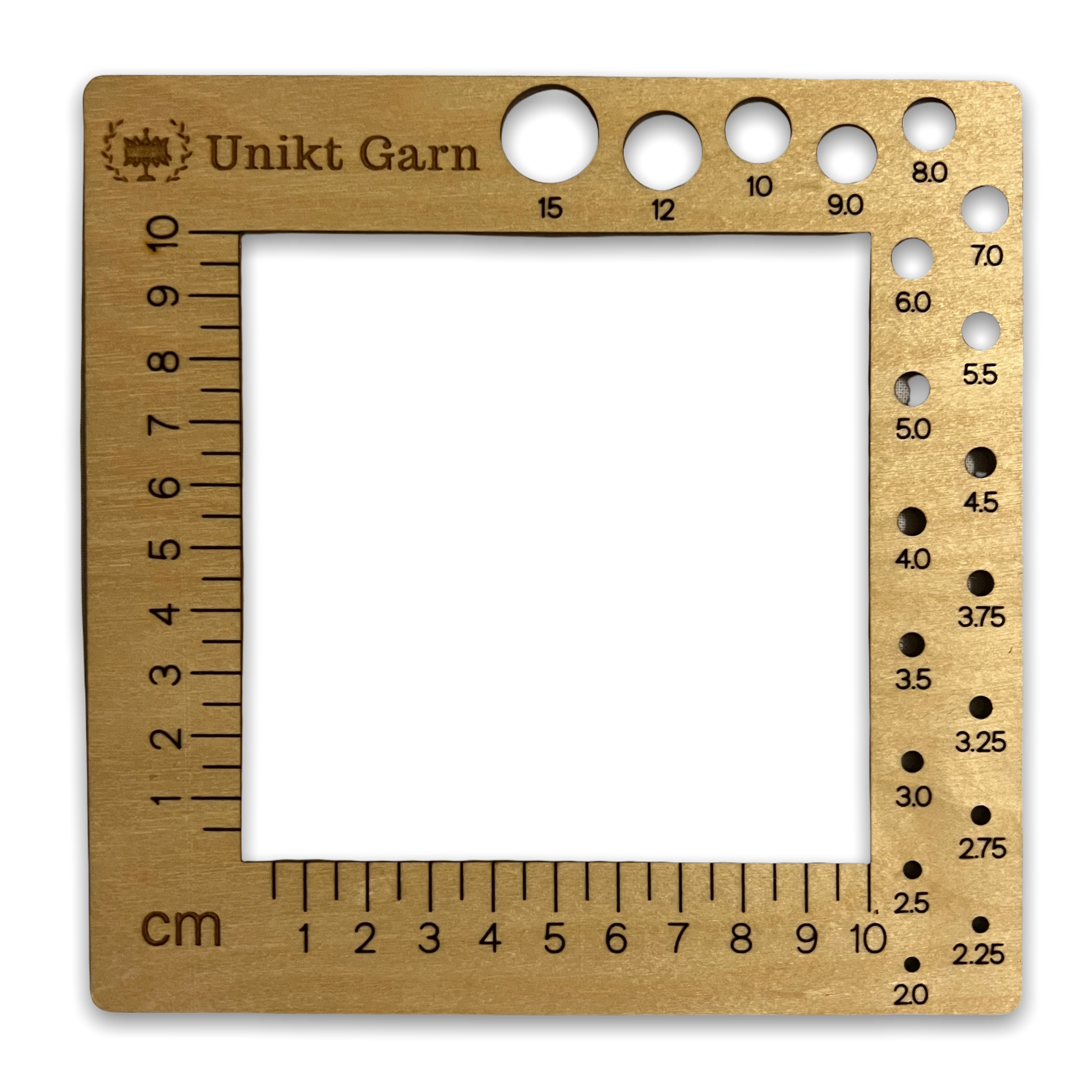Ruler that makes it easy to measure gauge, both in width and height. Correct gauge is crucial for the garment to end up in the right size. Needle size from 2 mm to 12 mm (5 cm)/2 mm to 15 mm (10 cm).