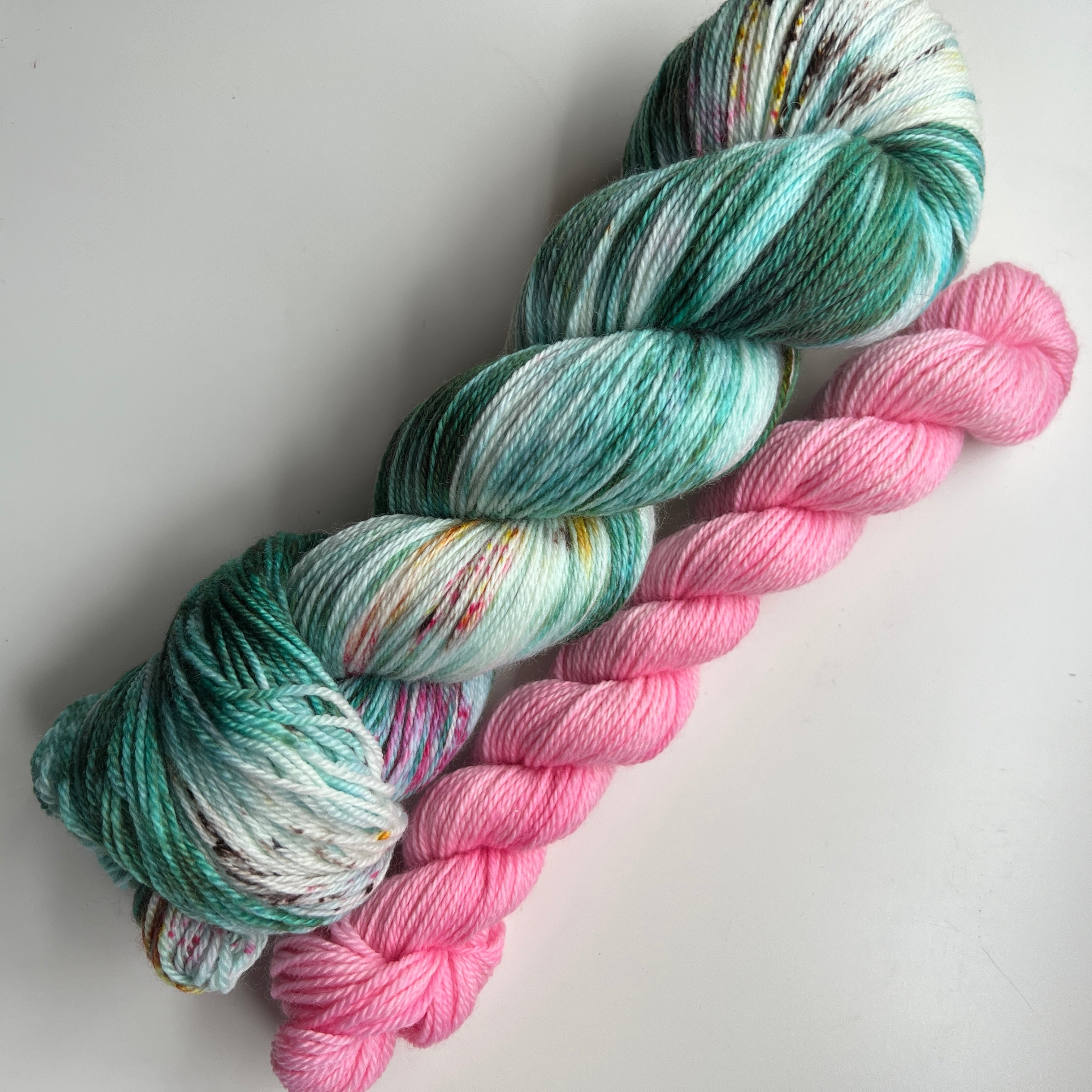 Handdyed sock kit consisting of one 100 g skein and one 20 g skein. The small skein is intended for the edge, heel and toe, while the rest is knitted with the large one. This is normally enough for a pair of socks up to size. 46. This yarn is called luxury sock yarn, and is both very soft and durable.