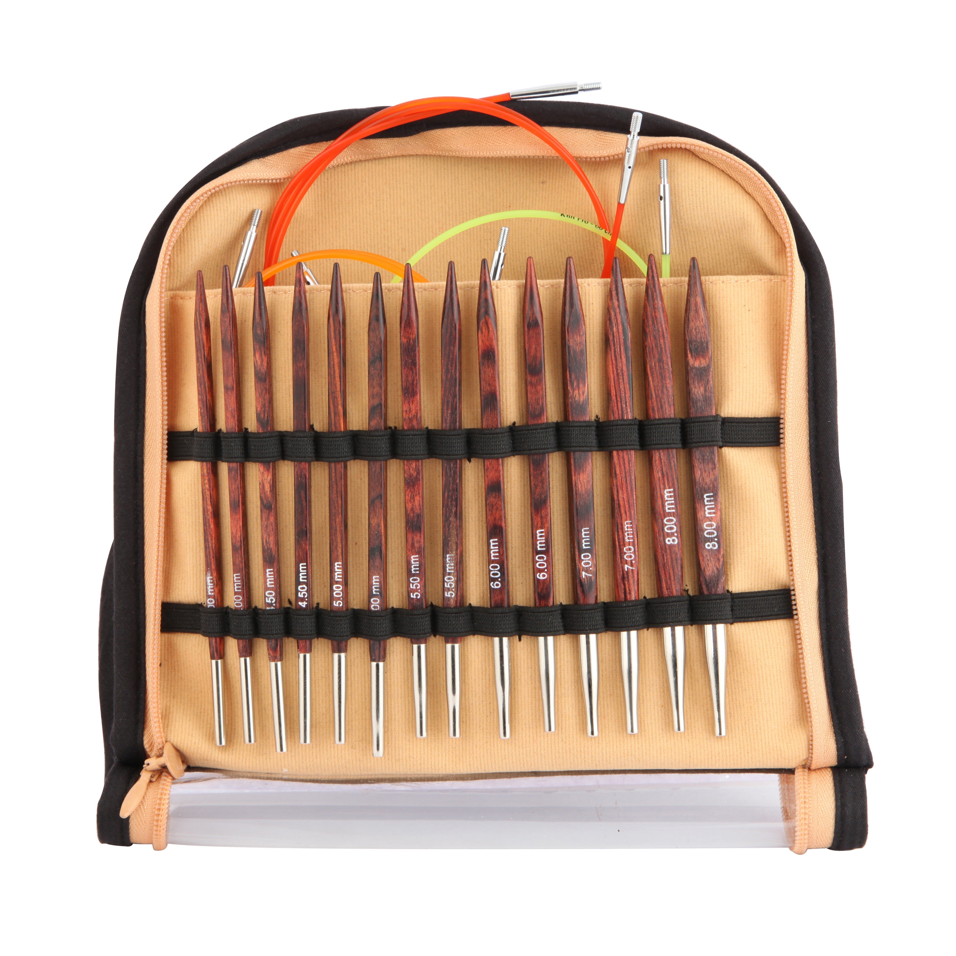 Set of 7 sizes of Symfonie Cubics Interchangeable Circular Needles packed in an attractive black jacquard fabric case.
