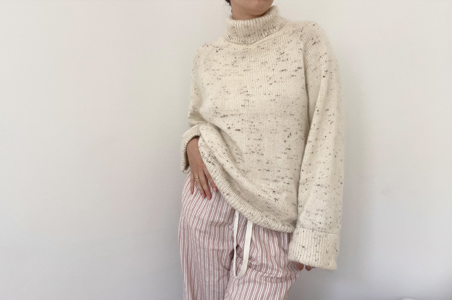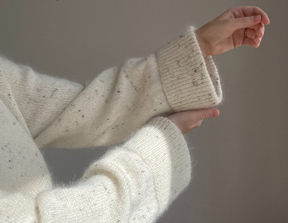 Yarn kit for Birch Sweater from ullen knitwear. With this yarn option, the sweater is knitted in 1 strand 4-ply Pure Merino Wool in the colorway Cookies & Cream together with 1 strand Lace mohair/silk in Natural. The pattern is included.