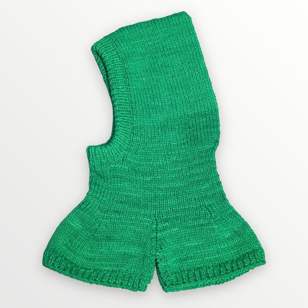 The front piece and the back piece are knitted back and forth on circular needle separately, from the bottom up to after the split. The work is then put together, and it is further knitted in the round on circular needles. The stitches are cast off for the neck, then the work is knitted back and forth on a circular needles to the final measurements. The balaclava is sewn together at the top with a mesh stitch. Finally, an edge is knitted in purl around the face opening which is fastened on the inside.