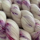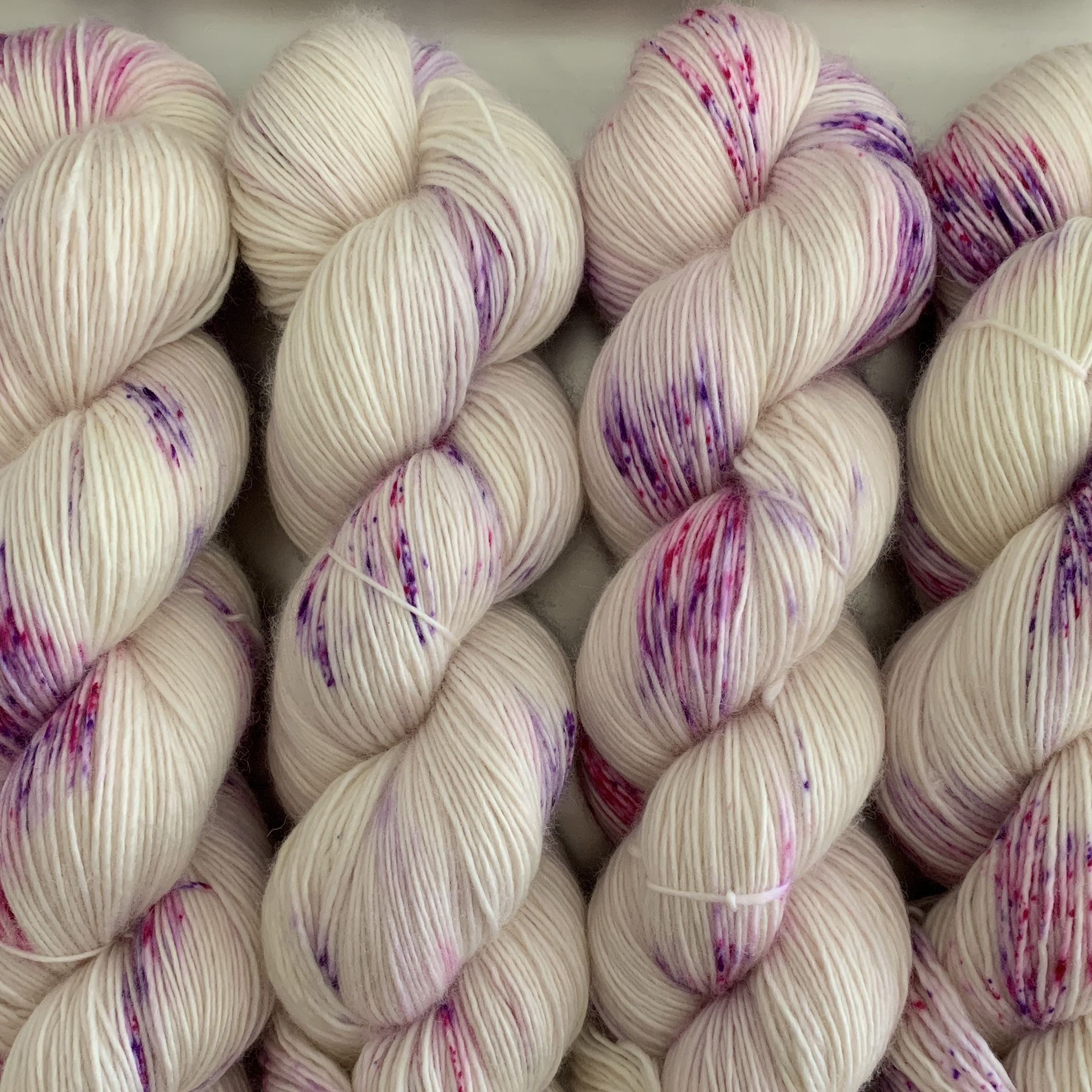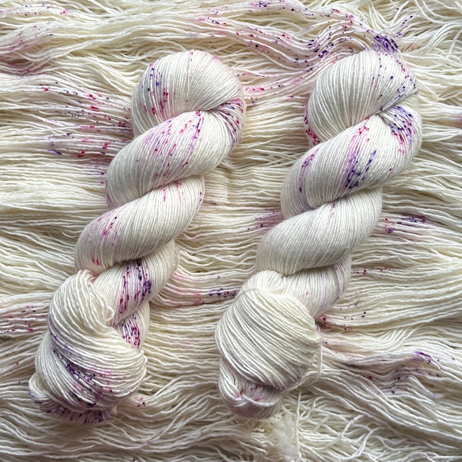 Handdyed yarn in the softest single merino wool with speckles in pink and purple.