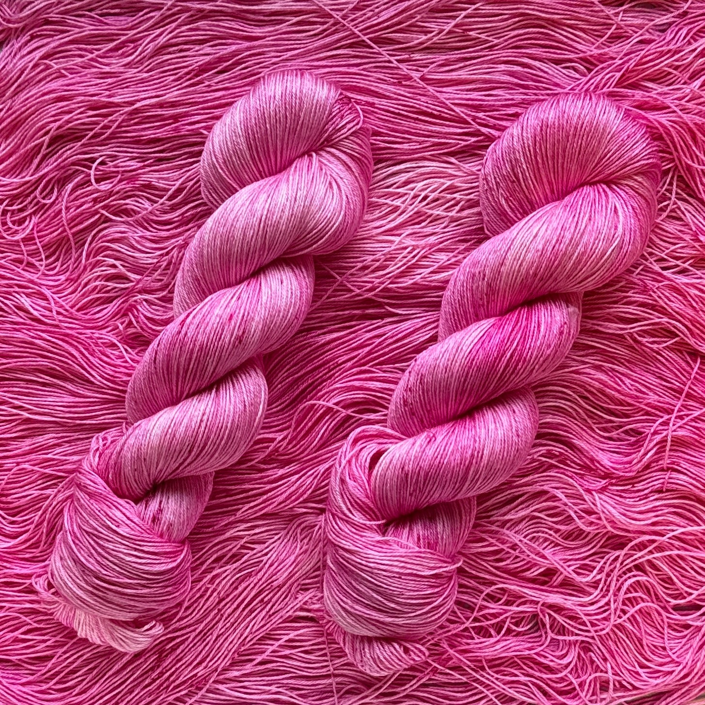 Hand-dyed yarn in exciting pink tones. This can be combined with a complementary strand.