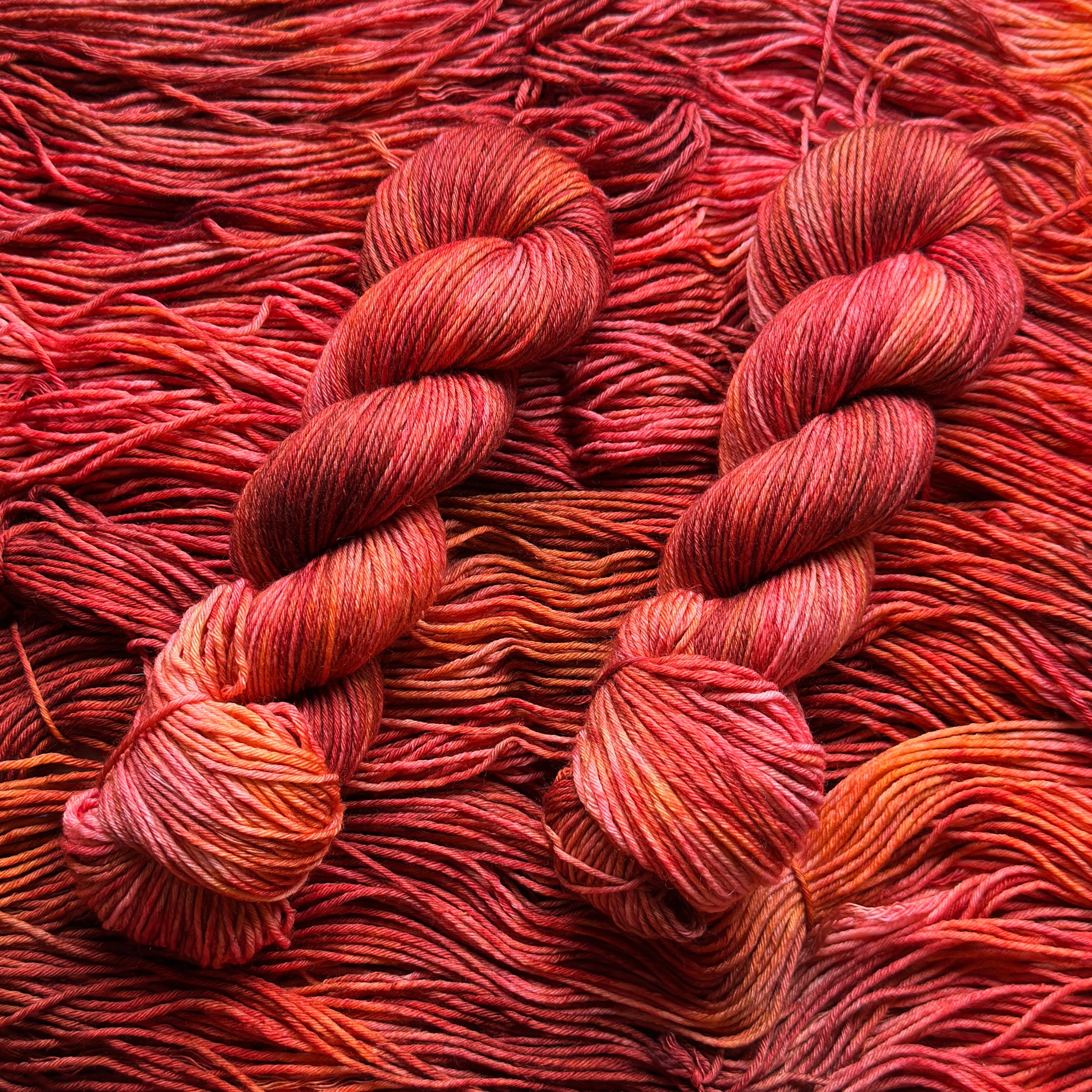 Handdyed yarn in lovely soft merino wool. The yarn can be knit in combination with other yarn types.