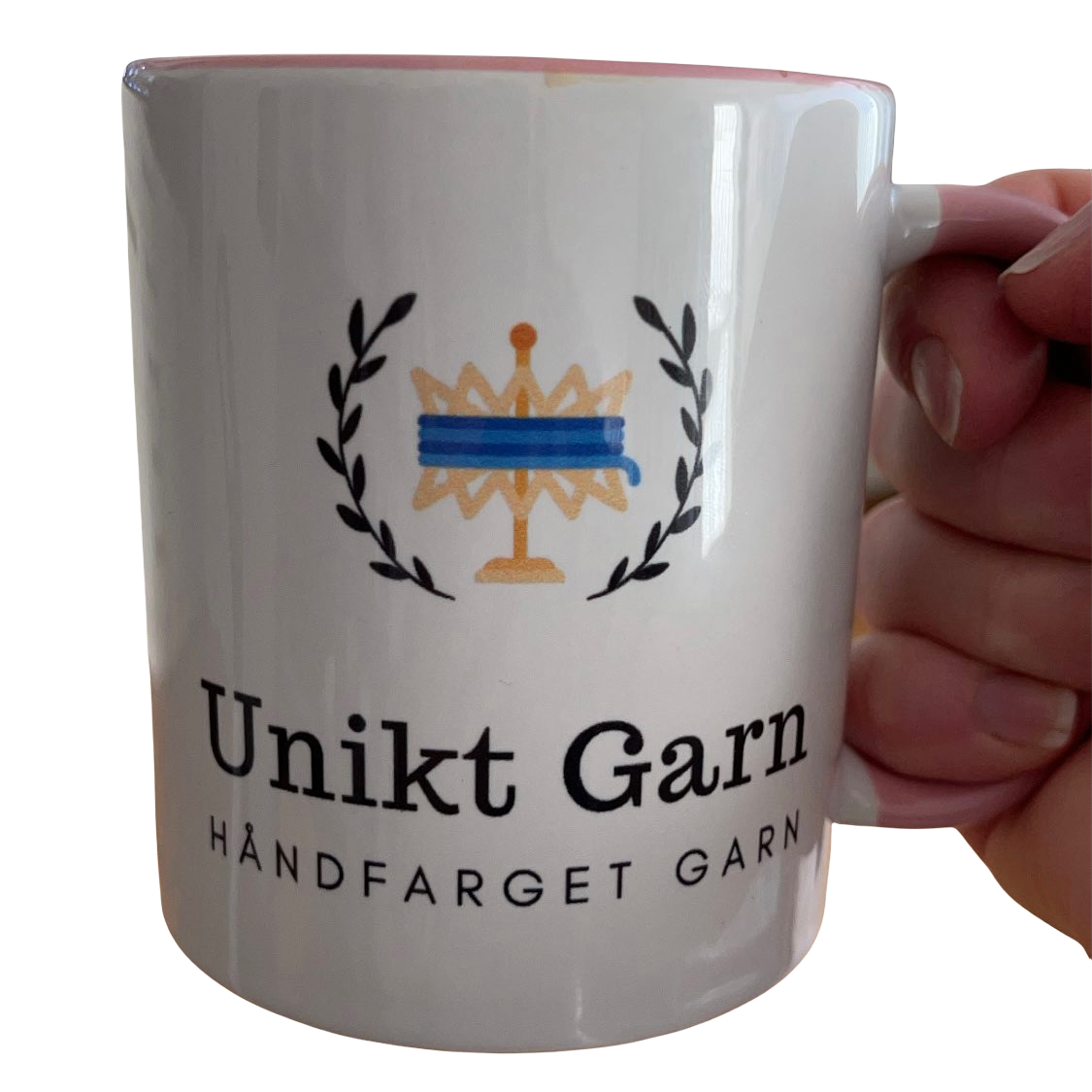 The coffee mug holds 325 ml. It has a white outside, and a pink inside and handle.