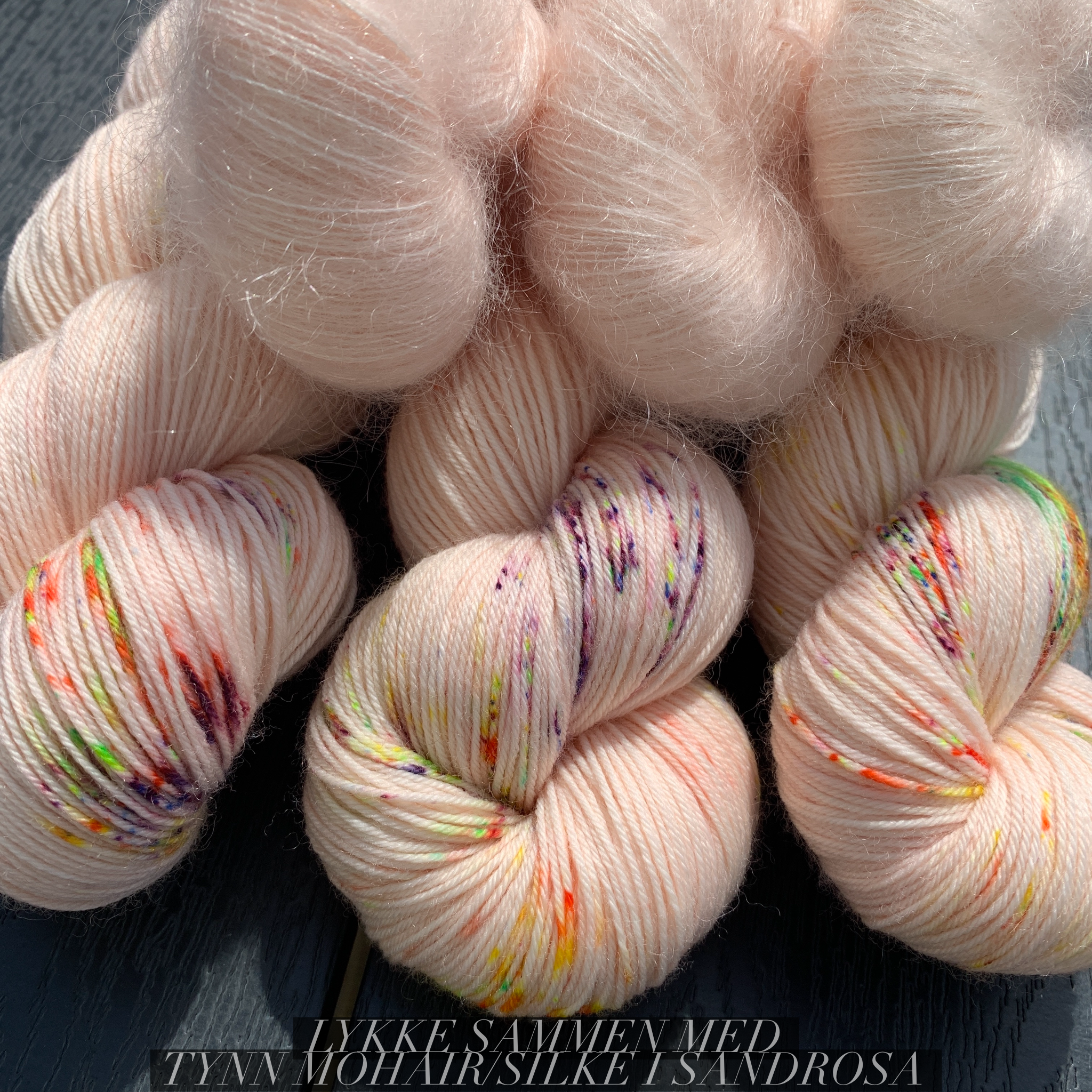Hand-dyed yarn in a nude shade with speckles in vibrant colors. Matching colorway in Lace Mohair Silk can be found here.