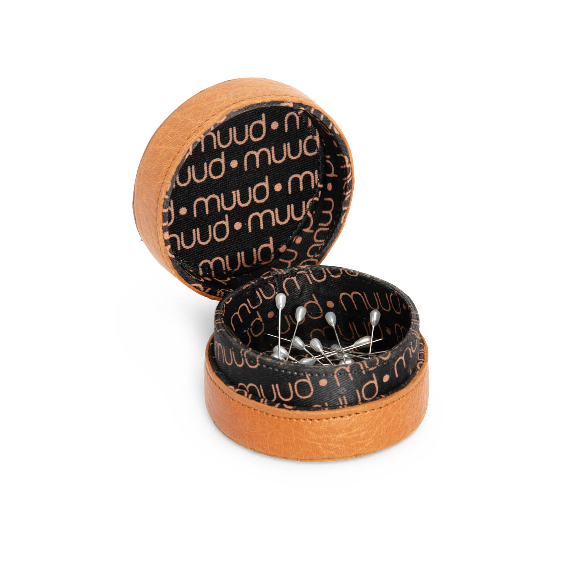 The leather box is closed with a nice lid that is placed loosely on the box without a zipper. The sides of the box are attached, and it therefore stands firmly on the table. The bottom of the box is magnetic so it is easier to keep track of your needles.