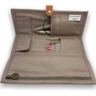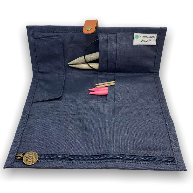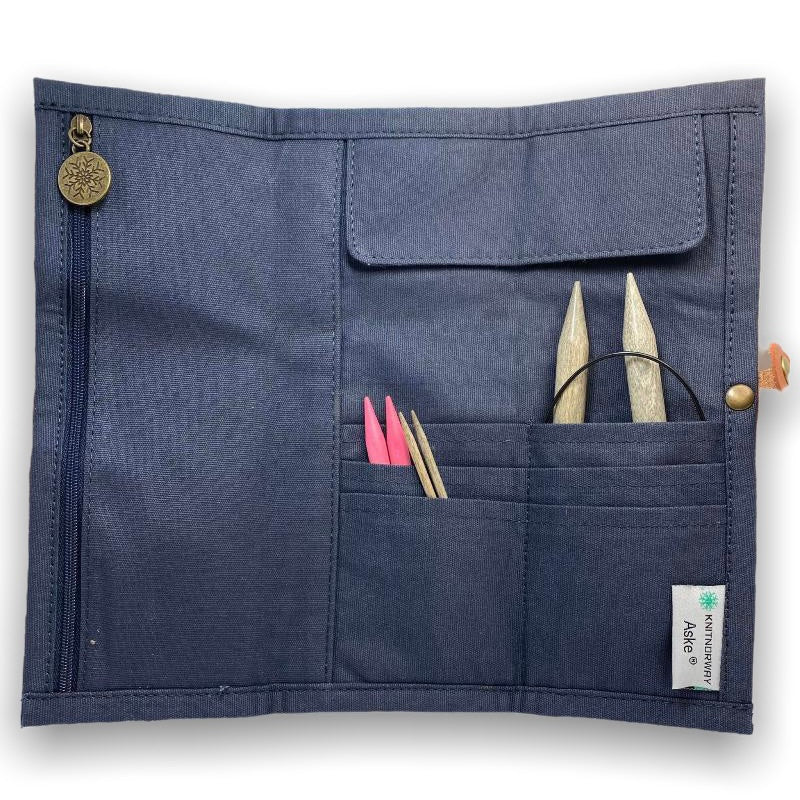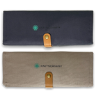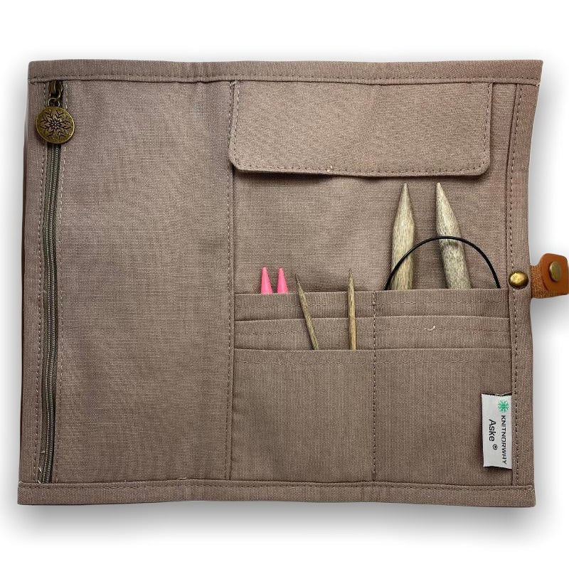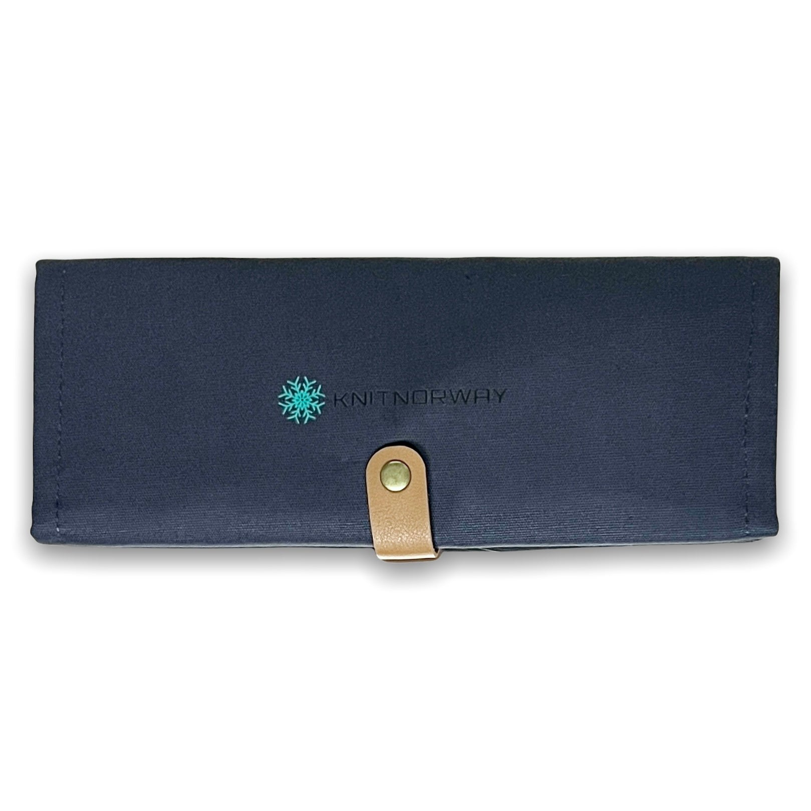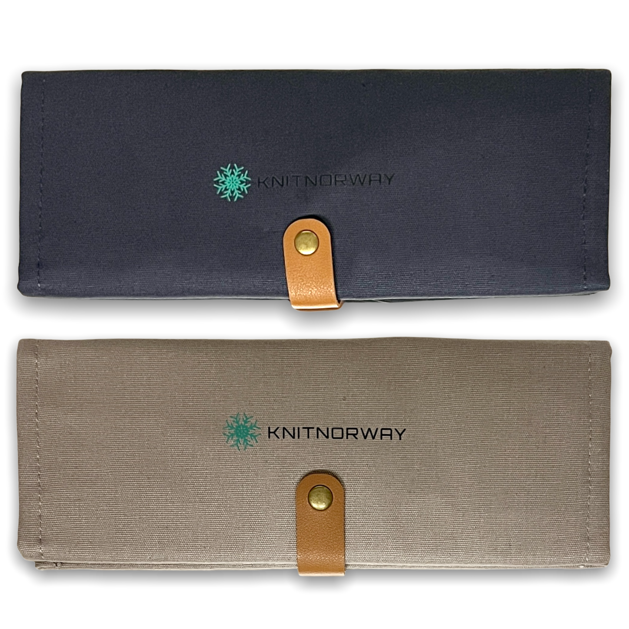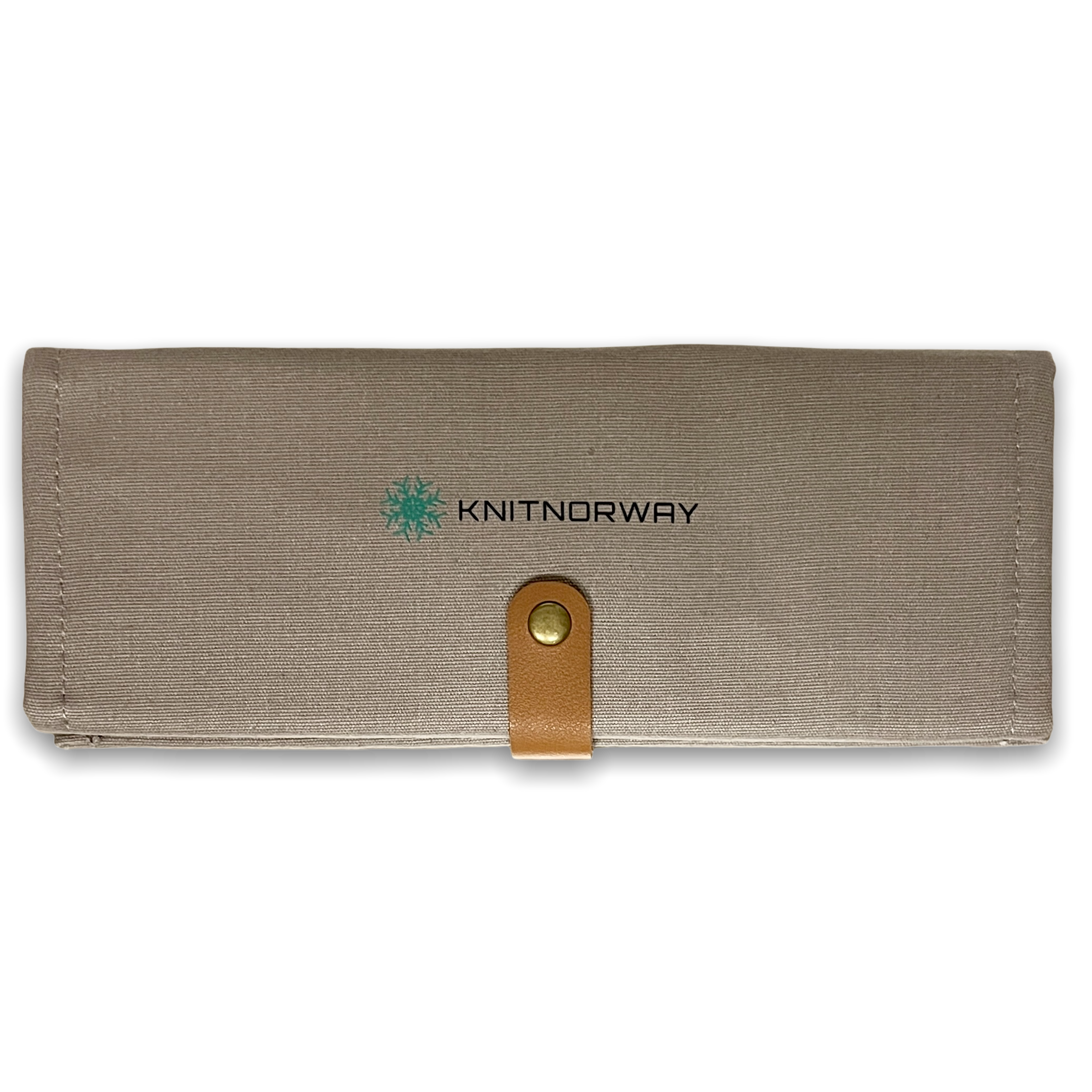 Stick case in strong cotton canvas. The bag has 8 inside pockets for storing your round pins and sock pins. The case is closed with a push button.