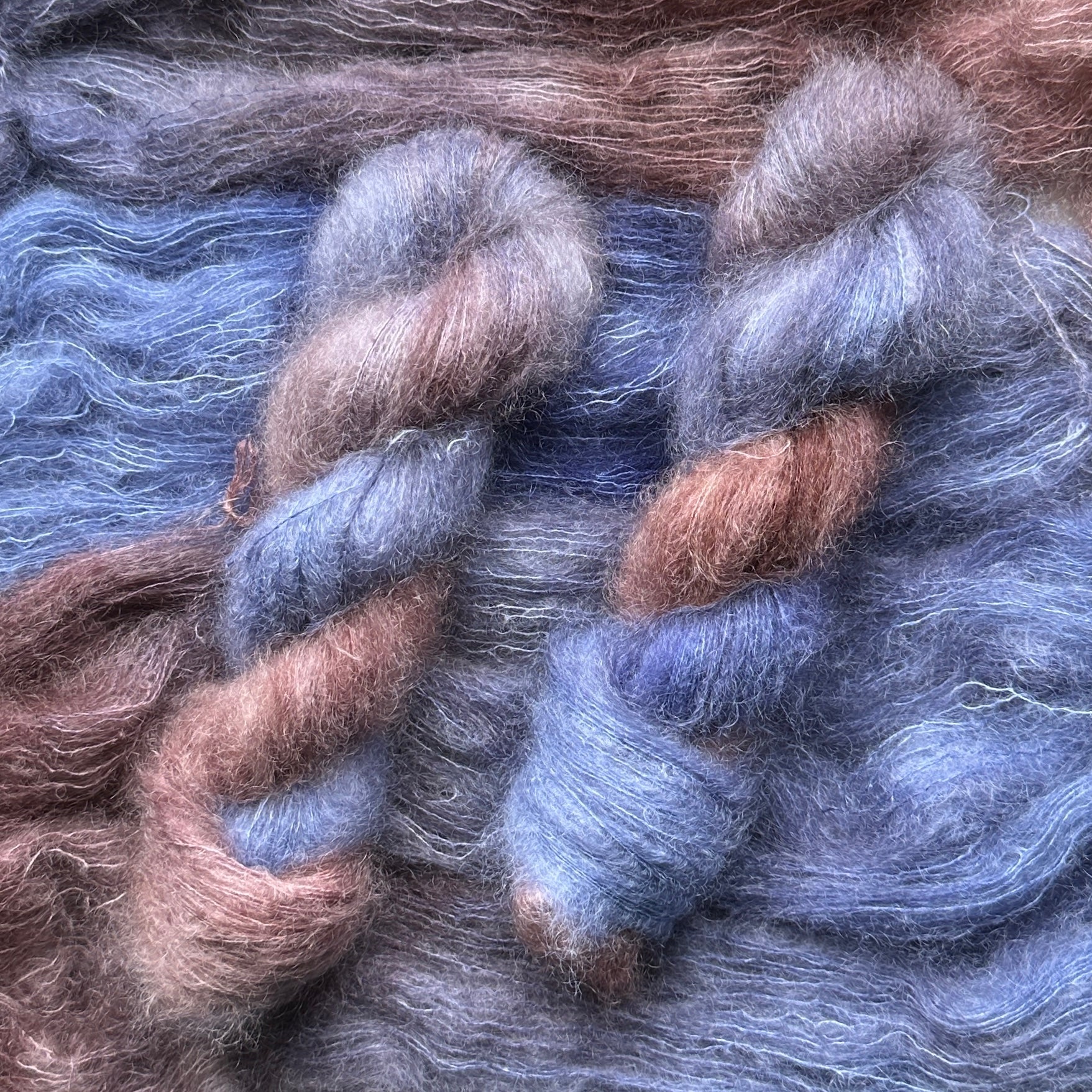 Handdyed -dyed yarn in navy, brown and a little purple tones.