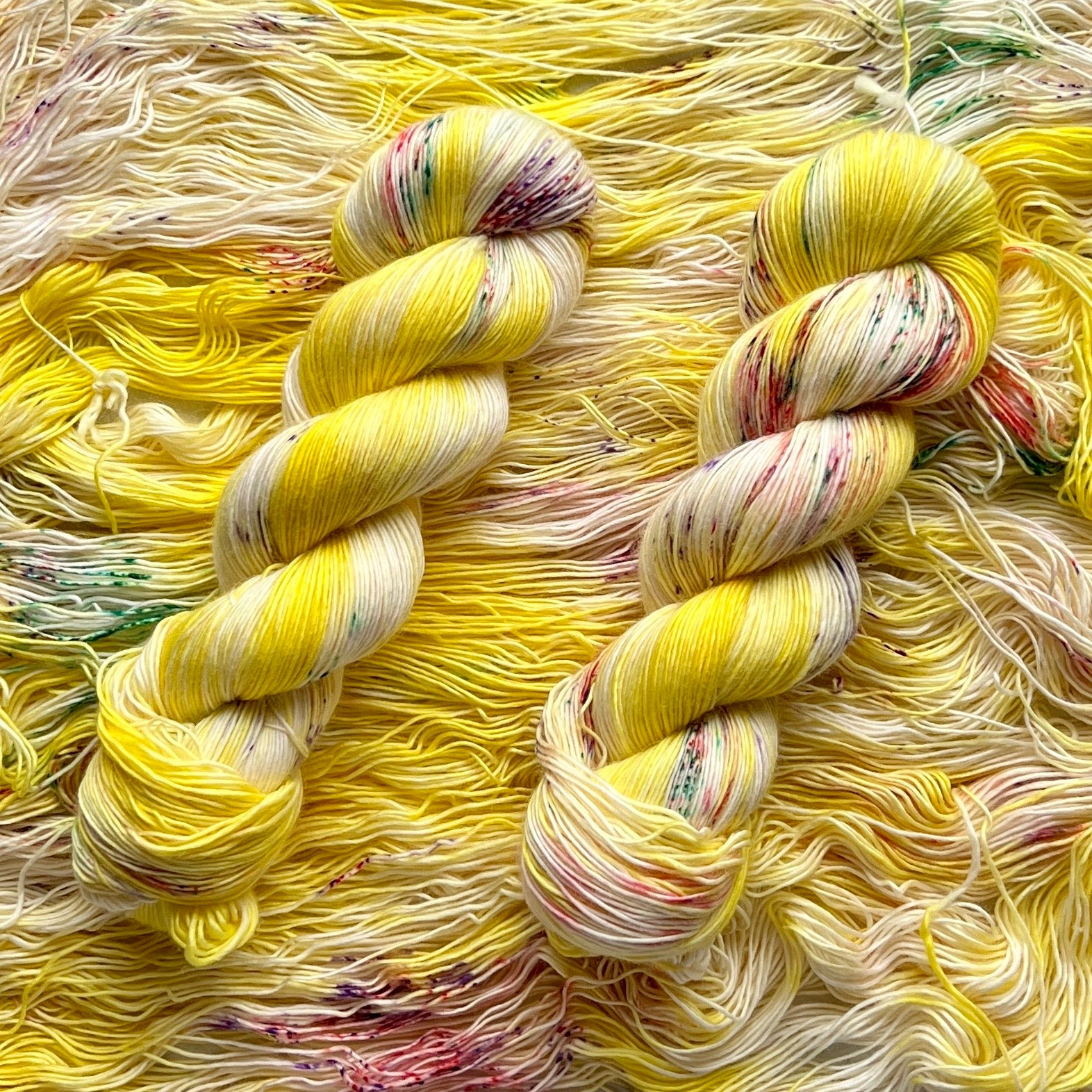 "Sin in Your Heart" is a colorway in a beautiful bright yellow nuance with speckles in green, purple and red.