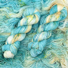 Handdyed yarn in green, yellow and beige tones with color specks.